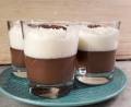 1. Pre čokoládovú vrstvu v hrnci zohrejeme smotanu na šľahanie a keď začína vrieť, odstavíme, pridáme na menšie kúsky posekanú čokoládu. Keď sa čokoláda úplne roztopila, pridáme aj škrob a dôkladne pomiešame, aby neostali hrčky, na miernom ohni počas stáleho miešania varíme ešte minútu. Hotový krém nalejeme do pohárikov (cca do polovice alebo do tretiny), ktoré vložíme do chladničky.