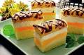 3. Potom na krém natrieme dotuha vyšľahanú šľahačku so stužovačom. Piškóty namáčame do džúsu s rumom a poukladáme ich tesne vedľa seba na šľahačku. Vrch ozdobíme roztopenou čokoládou. Rezy krájame medzi piškótami.